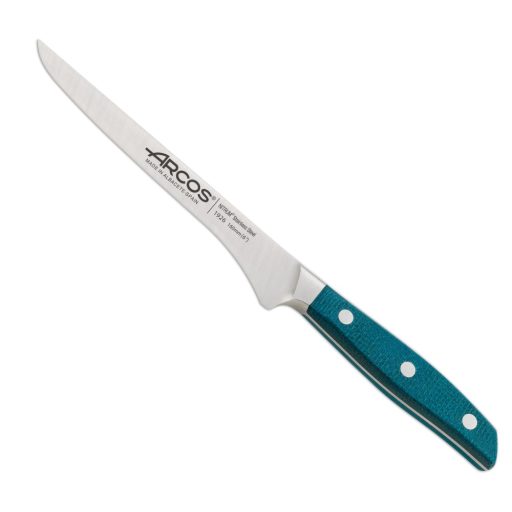Brooklyn csontozókés, mely a spanyol Arcos cég 2019 évi újdonsága. A 16 cm hosszúságú, kényelmes fogást, könnyű munkát biztosító kés a kovácsolt acélból készülő Brooklyn család tagja.Segítségével könnyedén leválaszthatja a húst a csontról még a "szűkösebb" helyeken is. A termék kovácsolt vas "silk" pengéje a hagyományos és a legmodernebb technológiák ötvözéseként született erősített, kovácsolt NITRUM rozsdamentes acél. A vágóél hosszú élettartamát kiegészíti a kényelmes használatot biztosító lekerekített felső él. A kés igazi különlegességét mégis lenyűgöző színű, különleges Micarta nyele biztosítja. A nyél formájának (a féltámasz kialakításnak) köszönhetően könnyen élezhető, és könnyed vágást tesz lehetővé. A nyél Micarta technológiával készül. Az előállítás során textil/vászon lapokat és műgyantát rétegeznek, préselnek, mely a nyél formázásának, készre csiszolásának folyamán gyönyörű mintázatot biztosít. A nyél ellenáll a magas hőmérsékletnek és a környezeti páratartalomnak, szegecsei rozsdamentesek így a hosszú, korróziómentes használat garantált. A Brooklyn család tagjaival tökéletesen vághat, de vigyázzon, hogy figyelmét ne vonja el a kés szépsége! A termék roppant mutatós, kiválóan alkalmas akár ajándéknak is.