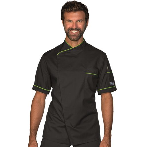 Dubai fekete rövid ujjú szakácskabát zöld paszpóllal díszítve Dubai fekete rövid ujjú szakácskabát zöld paszpóllal díszítve