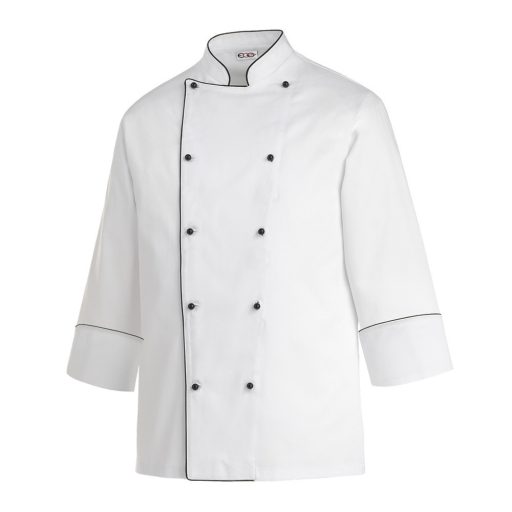 Fehér hosszú ujjú szakácskabát, fekete paszpóllal és kivehető fekete gombokkal