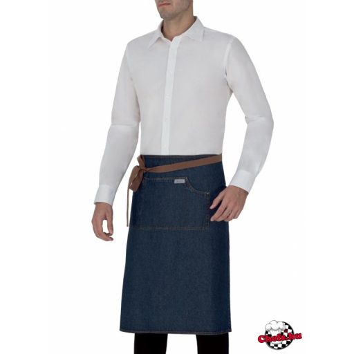 Vasaláskönnyített anyagból készült derekas kötény, középen egy nagyméretű, 3 rekeszes zsebbel.