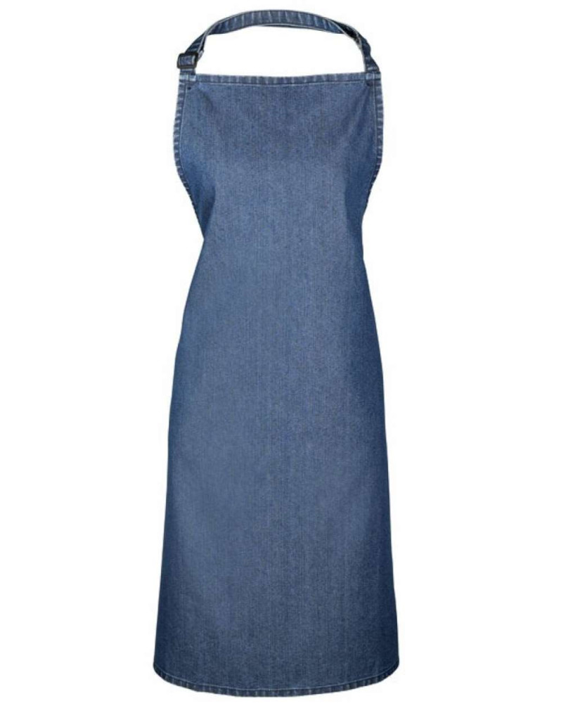 Indigókék színű farmerkötény állítható nyakpánttal, zseb nélküli változatban.