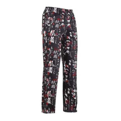 Fekete alapon japán írásjelekkel és motívumokkal díszített szakácsnadrág teljesen gumírozott derékrésszel, megkötővel,