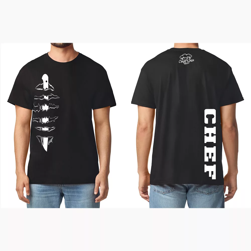 Az egyedi nyomat nem véletlenül ennyire ütős: mert a séf fegyvere a kés. A hátoldali CHEF felirat pedig gyakorlatilag figyelmeztetés.
