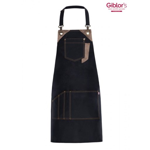 Fekete színű, divatos melles kötény, barna bőrhatású betétekkel a méltán híres gasztro munkaruha gyártó, Olasz, Giblors company-től...