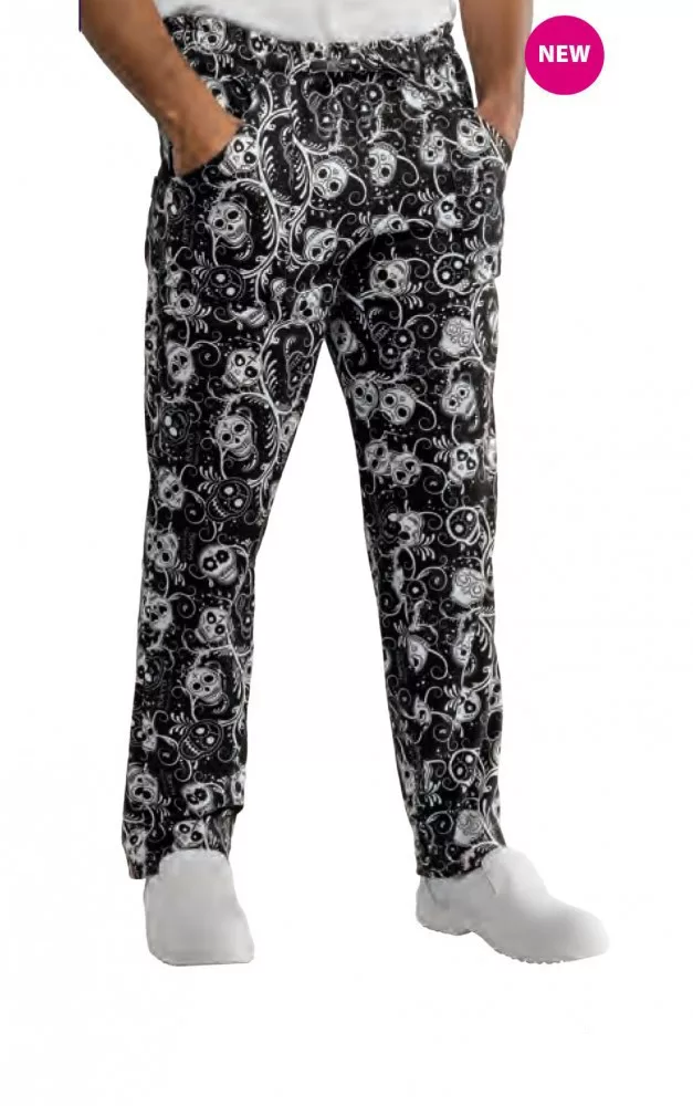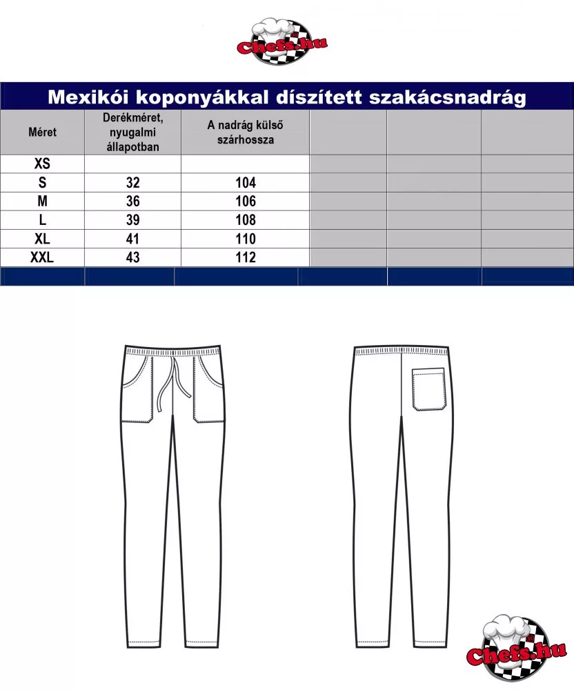 Gumis, kötős derekú, koponyákkal díszített szakácsnadrág két rávarrt oldalzsebbel és egy hátsó zsebbel.