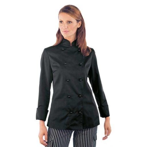 Fekete, hosszú ujjú, női szakácskabát, mellvarrással, a bal karján tollzsebbel.