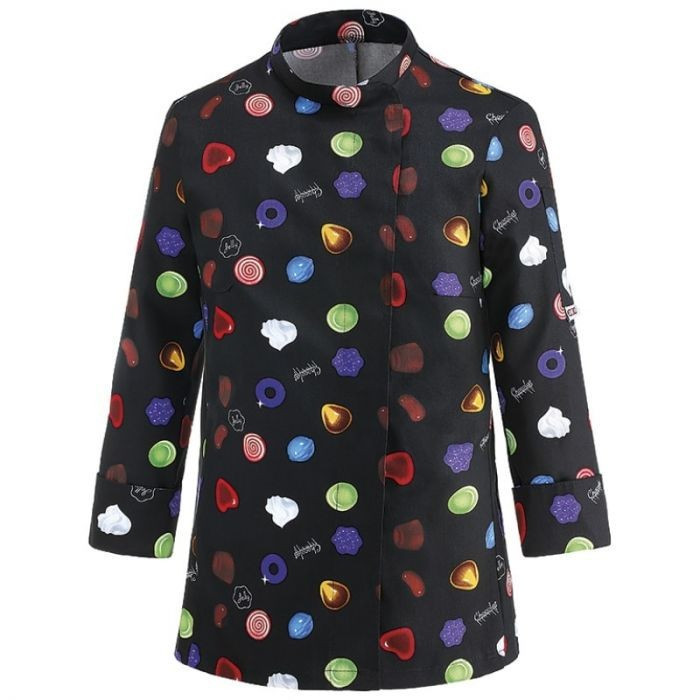 Fekete alapon, BON BON-okkal díszített, karcsúsított női szakácskabát.