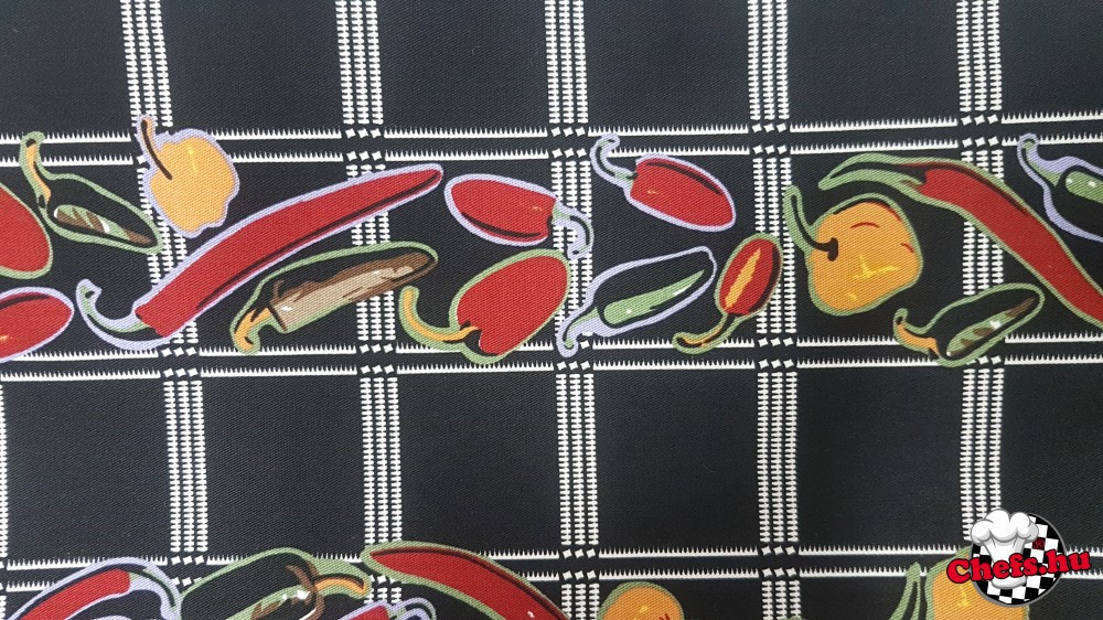 Fekete alapon színes paprikákkal és kockákkal díszített szakácsnadrág teljesen gumírozott derékrésszel, megkötővel,
