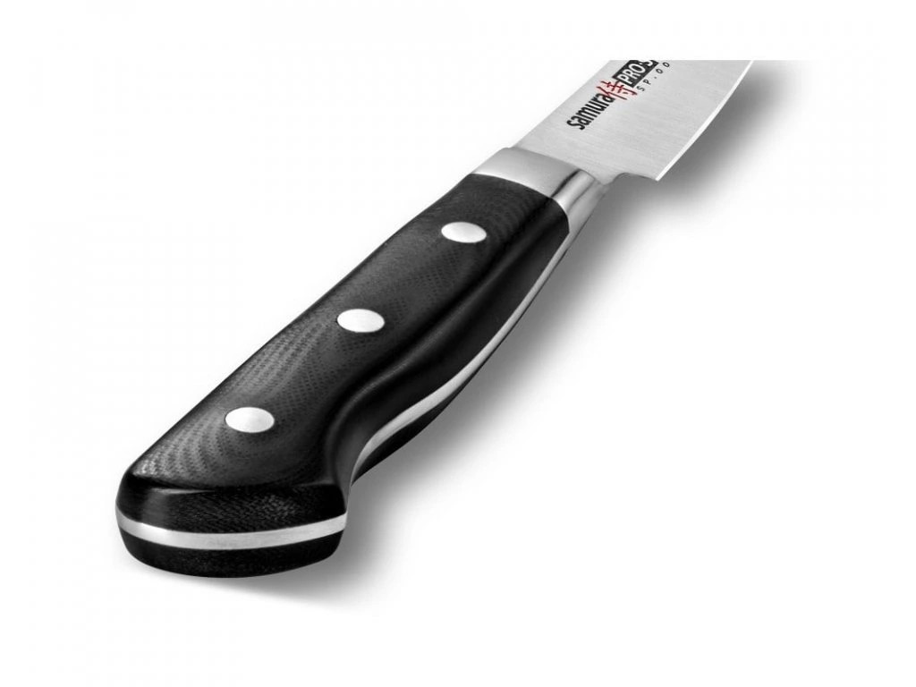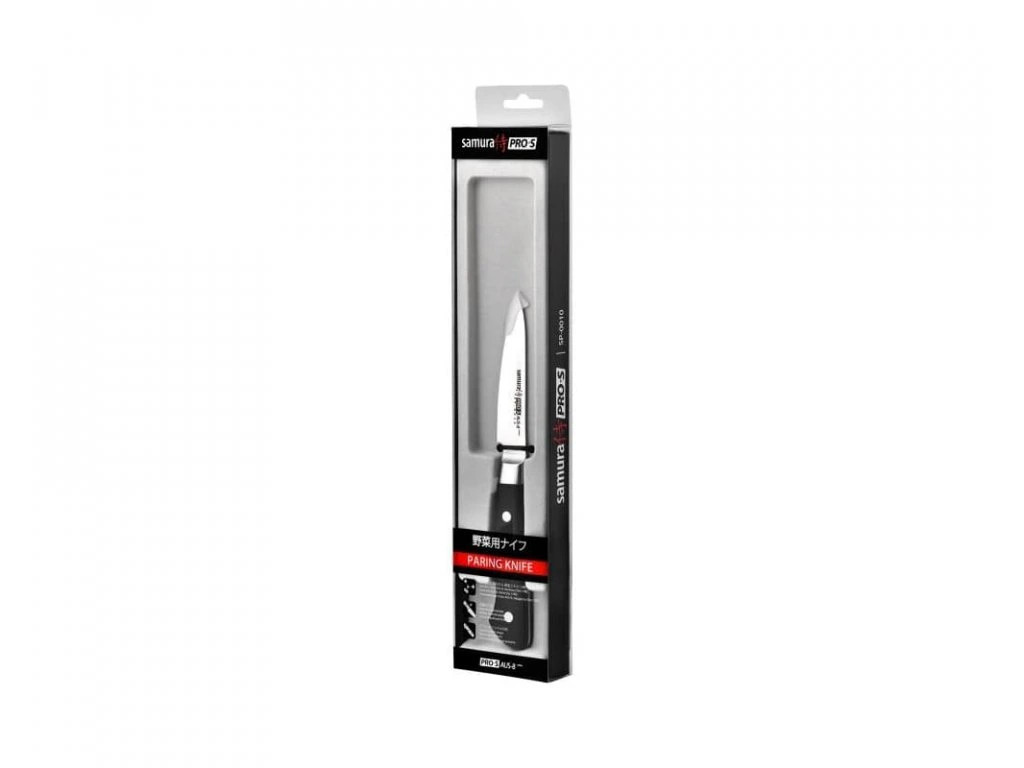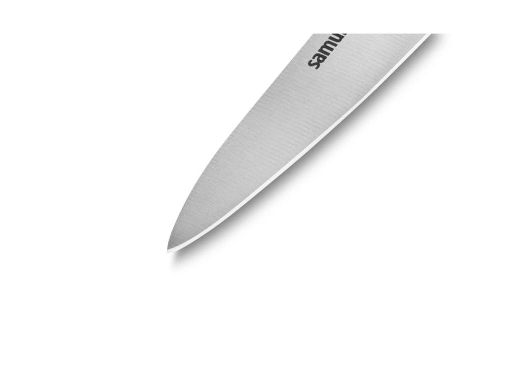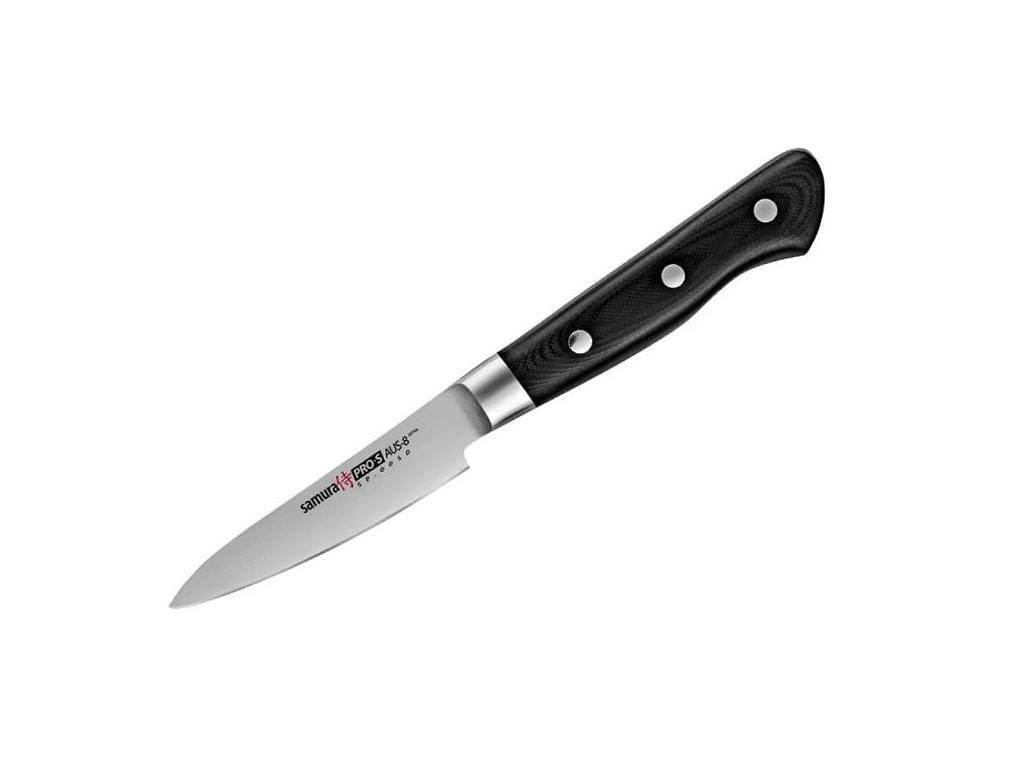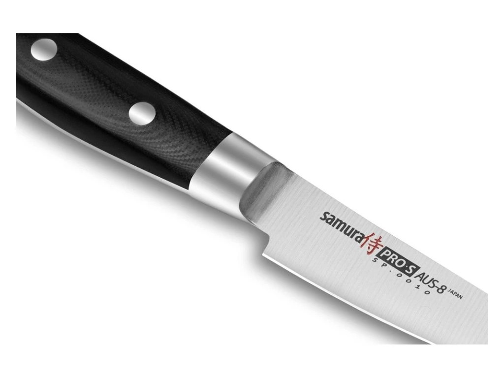 Kiváló minőségű japán AUS-8 rozsdamentes acélból készült, európai típusú konyhakés, 8,8 cm hosszú pengével. A G10 kompozit anyagból készült markolat erős, tartós és kellemes tapintású. A kést főleg zöldségekkel vagy gyümölcsökkel végzett munka során használhatja. A kést egy szép papír–műanyag dobozba csomagolják.