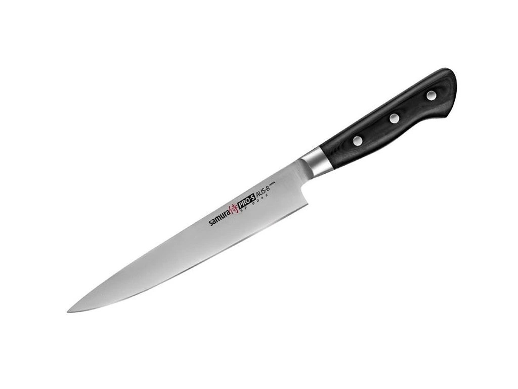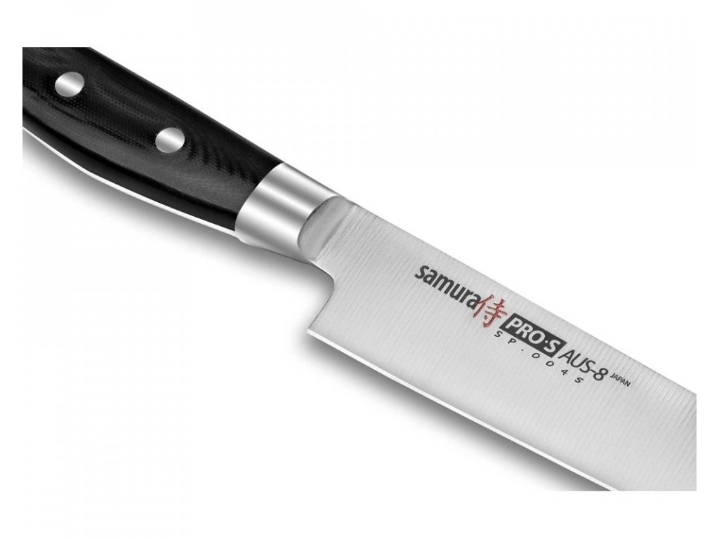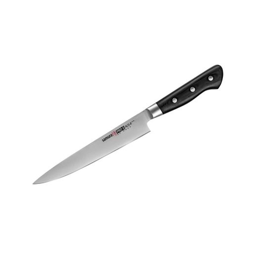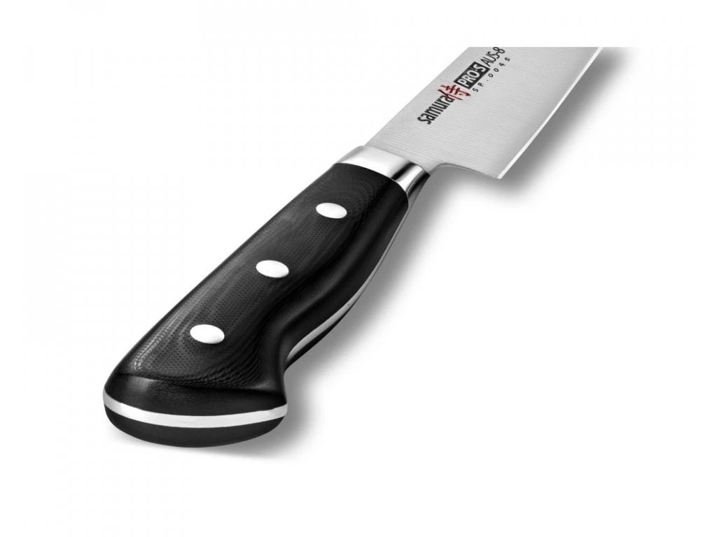 Nagy konyhakés 20 cm hosszú pengével, kiváló minőségű japán AUS-8 rozsdamentes acélból. A G10 kompozit anyagból készült markolat erős, tartós és kellemes tapintású. A kést elsősorban vékony hússzeletek, sonka és egyéb alapanyagok szeletelésére használhatja. A kést egy szép papír–műanyag dobozba csomagolják.