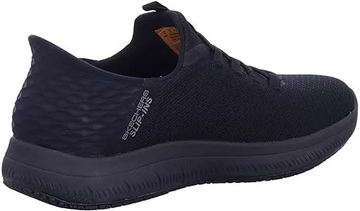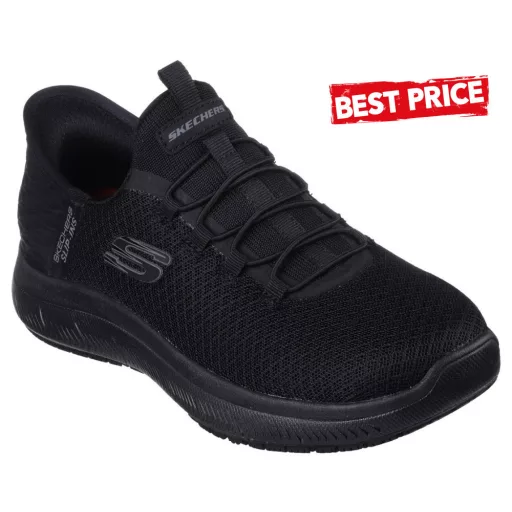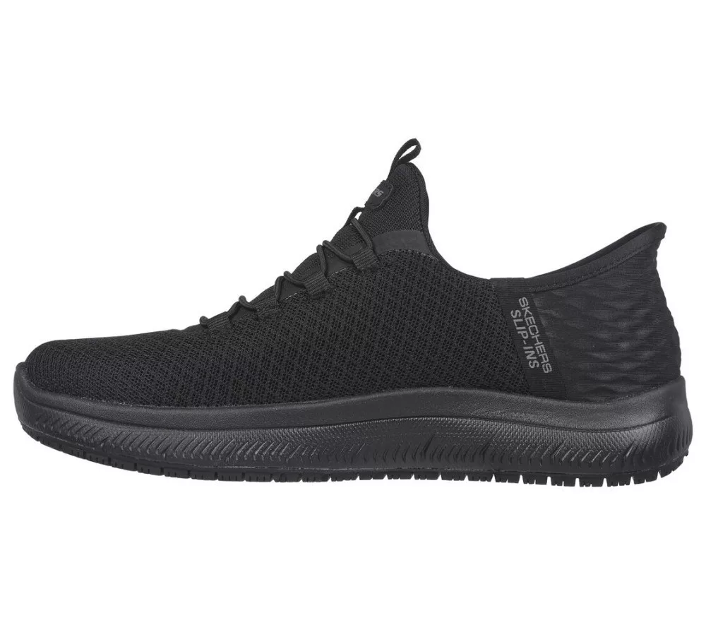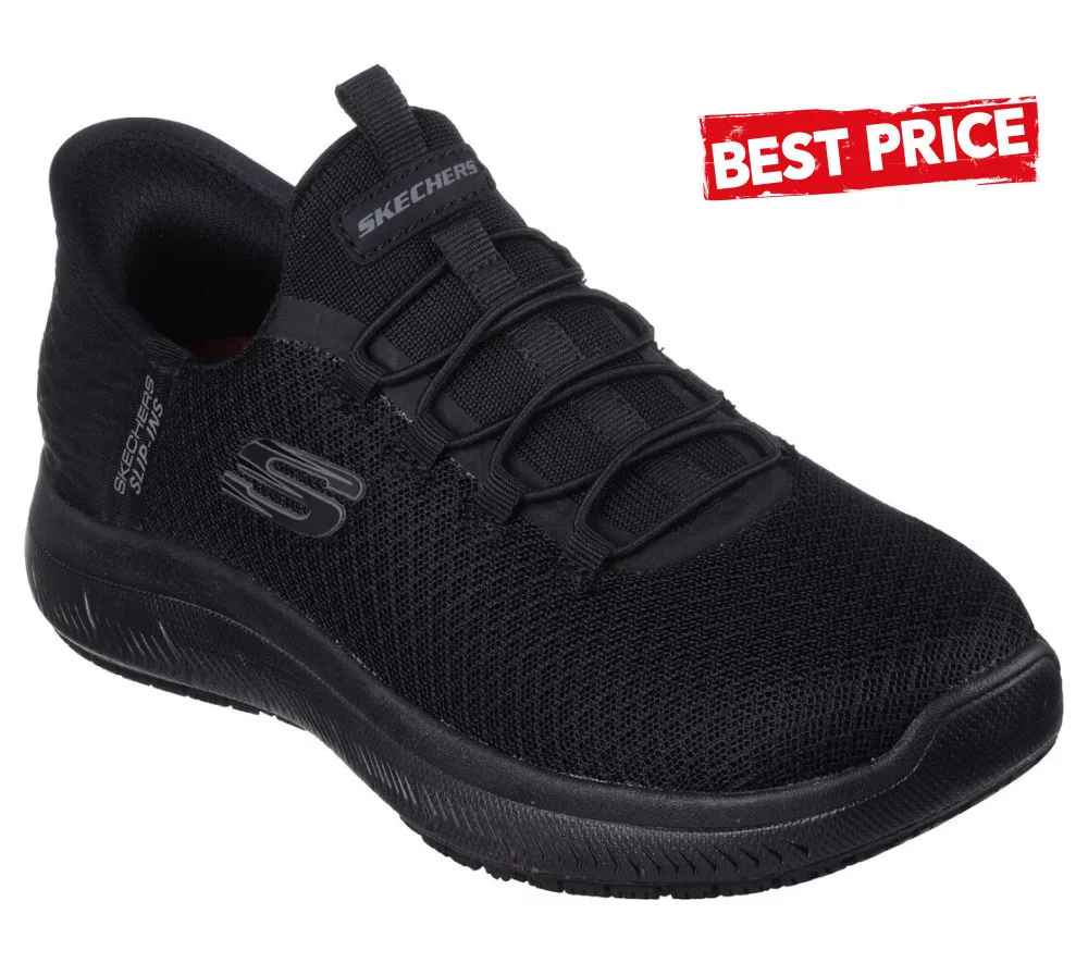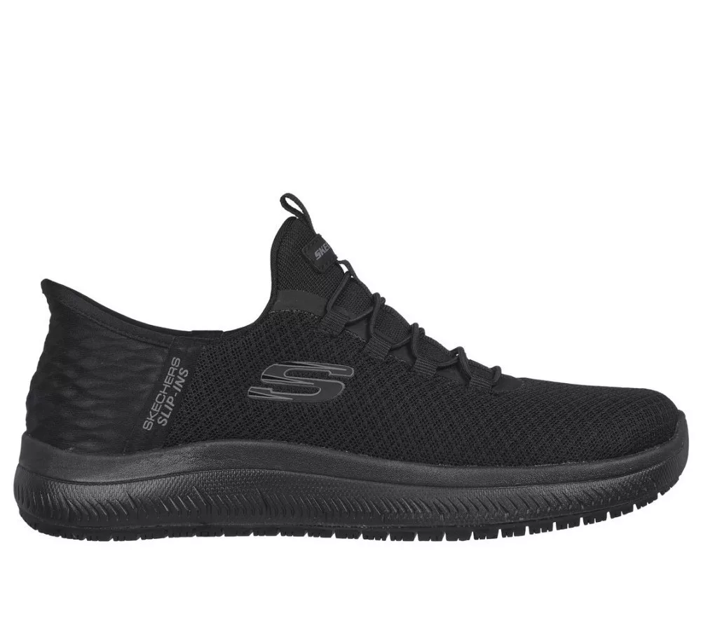 Tapasztald meg a csúszásgátló biztonságot és a belebújós kényelmet – Skechers Hands Free Slip-ins™ Work™: Summits SR - Enslee. Ez a TOUCHLESS FIT® munkacipő modell kötött hálós és szintetikus felsővel, különleges Heel Pillow™ párnával, csúszásgátló külső talppal és Skechers Air-Cooled Memory Foam® kényelmes párnázott talpbetéttel készült