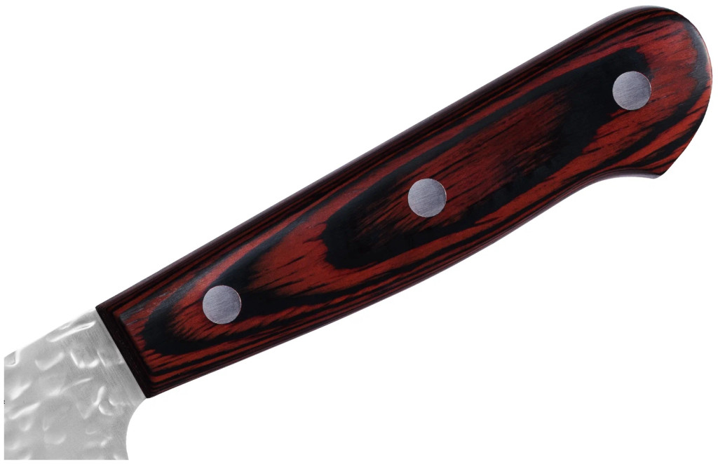 A 16,7 cm hosszú penge japán AUS-8 rozsdamentes acélból készült, amely ideális egyensúlyt kínál a keménység és a korrózióállóság között. A kalapált felület nemcsak egyedi megjelenést biztosít, hanem csökkenti a súrlódást és az élelmiszerek pengéhez tapadását. A félig fényes, finoman hullámos él precíz és sima vágást tesz lehetővé – legyen szó zöldségekről, gyümölcsökről vagy akár lágy húsokról.