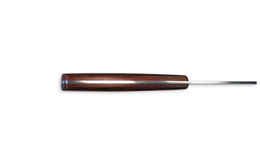 A Pakkafa markolat elegáns barna árnyalata és ergonomikus kialakítása nemcsak stílusos megjelenést ad, hanem kényelmes és stabil fogást is biztosít hosszabb használat során. A fa természetes textúrája és az acél kontrasztja a Kaiju kések védjegye – tökéletes egyensúly a funkcionalitás és esztétikum között.