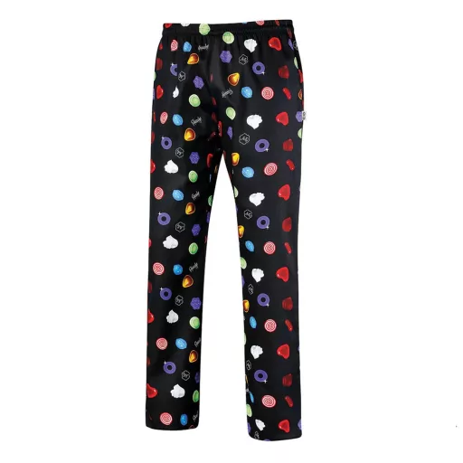Fekete alapon BON BON-okkal díszített szakácsnadrág teljesen gumírozott derékrésszel, megkötővel, két oldalsó és egy hátsó zsebbel.