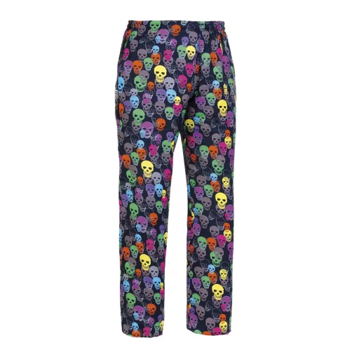 Színes koponyákkal díszített szakácsnadrág teljesen gumírozott derékrésszel, megkötővel, két oldalsó és egy hátsó zsebbel.