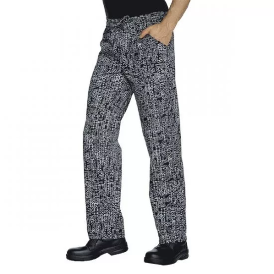 Fekete alapon városnevekkel díszített szakácsnadrág az olaszországi munkaruhagyártó ISACCO-tól.