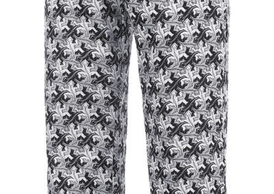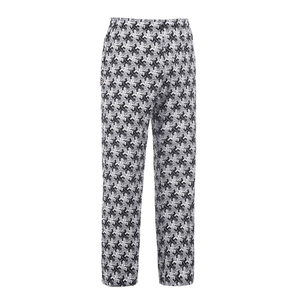 Szakácsnadrág, GEKO-k sokaságával díszítve, teljesen gumírozott derékrésszel, megkötővel, két oldalsó és egy hátsó zsebbel.