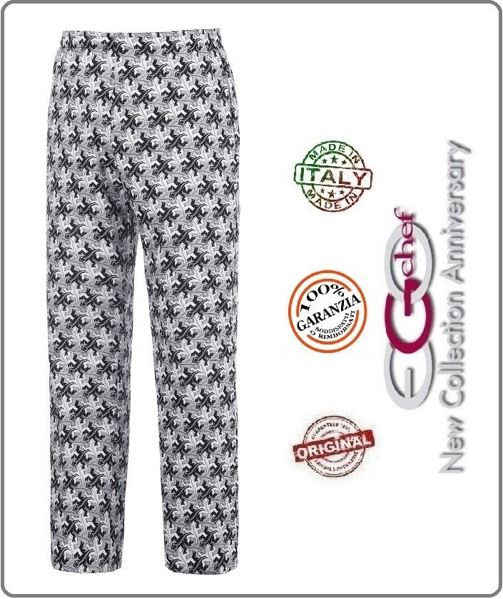 Szakácsnadrág, GEKO-k sokaságával díszítve, teljesen gumírozott derékrésszel, megkötővel, két oldalsó és egy hátsó zsebbel.