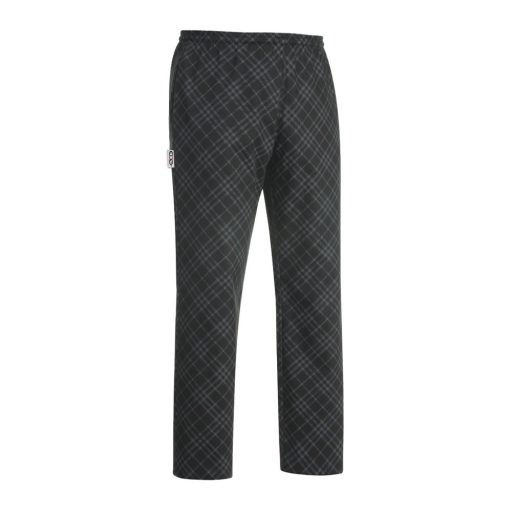 Fekete alapon szürke csíkokkal díszített szakácsnadrág teljesen gumírozott derékrésszel, megkötővel, két oldalsó és egy hátsó zsebbel.