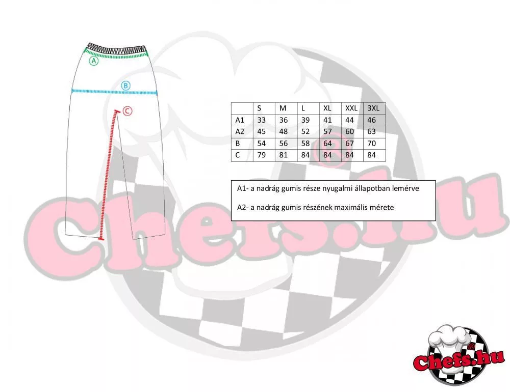 Teljesen gumírozott derekú szakácsnadrág egy hátsó és két oldalzsebbel.