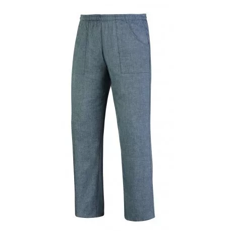 Világosszürke színű szakácsnadrág teljesen gumírozott derékrésszel, megkötővel, két rávarrt oldal- és egy hátsó zsebbel.
