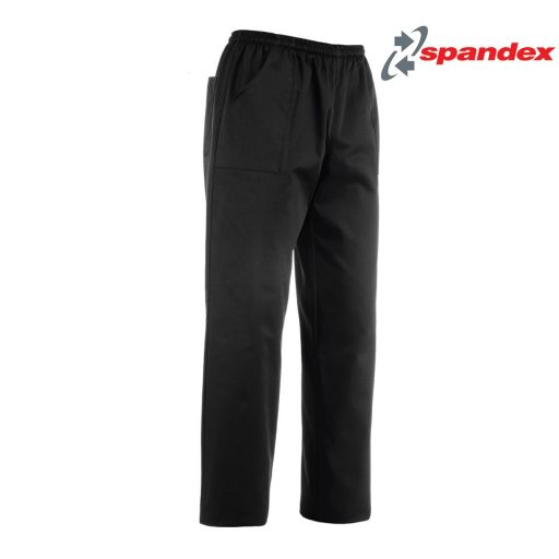 Fekete gumisderekú, rávarrtzsebes unisex szakácsnadrág, sztreccses anyagból. Ha igazán konfortosan szeretnéd madad érezni a munkahelyeden, akkor őt keresed!