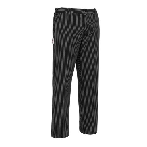 Fekete alapon vékony fehér csíkos szakácsnadrág az oldalán két svéd zsebbel és egy hátsó zsebbel.