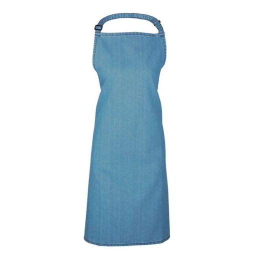 Világoskék színű farmerkötény állítható nyakpánttal, zseb nélküli változatban.