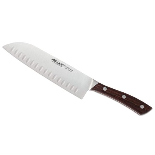 If You are the king of slicing and chopping then a really good Japanese knife is a must-have for Your kitchen. The 180 mm long, hollow edged blade of the Natura family santoku knife prevents food from sticking to it. This knife features classic shape and great quality! Attractive design, wooden handle for demanding customers. Handle: The Arcos Natura knives distinguish for their elegant rosewood handle. Blade: The blade is made of forged steel with NITRUM® coating which provides extremely strong, durable, outstanding cutting edge and resistance to dirt.