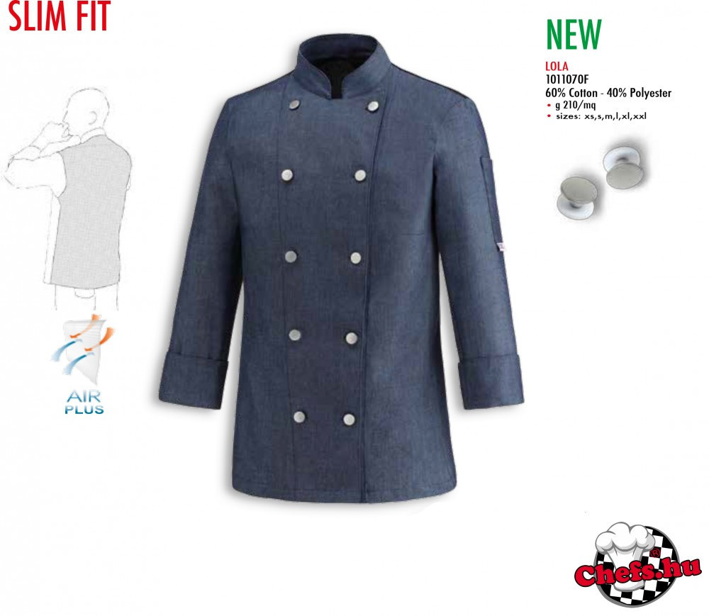 Farmer anyagból készült női, slim fit /karcsúsított/ szakácskabát az olaszországi szakács munkaruhagyártó EGOCHEF-től.