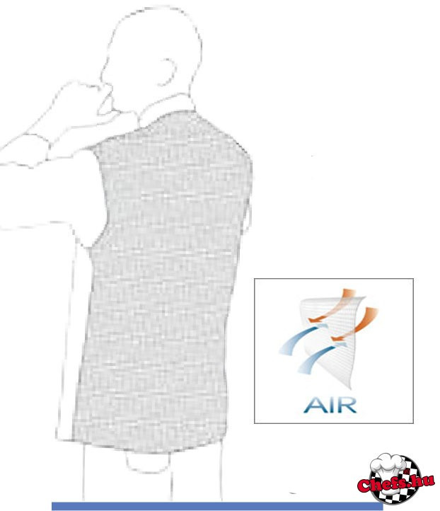 Fekete szakácsing szellőző hátrésszel, bal oldalon egy mellzsebbel és alul még két másik zsebbel, hogy legyen mit hova pakolnod... :)