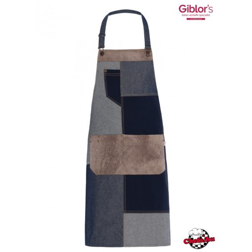 The apron is sewn from several different denim materials combined with alcantara inserts and pockets, provides a really modern look. The contrast stitching and brass metal rings make the apron even more unique.