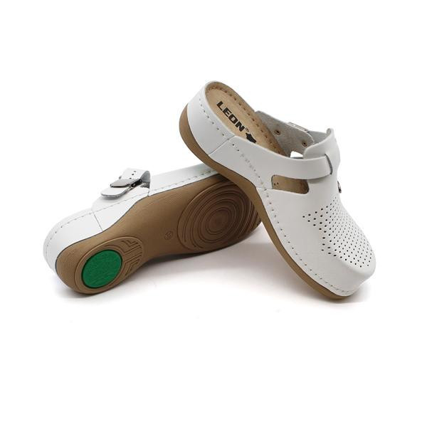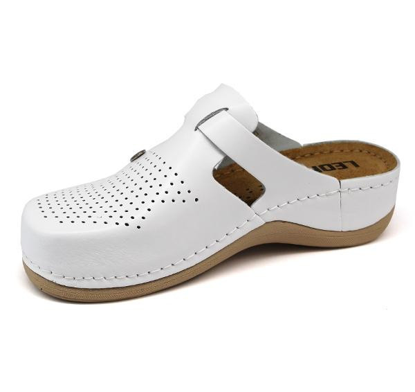 Női bőr klumpa, műanyag csúszásgátlós talppal. Oldalt fém csat található, amellyel szabályozni lehet a bőséget. A talpbetét puha zselés, bőr. A természetes anyagnak és a felsőrész lyukacsosságának köszönhetően, jól szellőzik.
