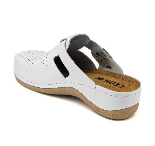 Női bőr klumpa, műanyag csúszásgátlós talppal. Oldalt fém csat található, amellyel szabályozni lehet a bőséget. A talpbetét puha zselés, bőr. A természetes anyagnak és a felsőrész lyukacsosságának köszönhetően, jól szellőzik.