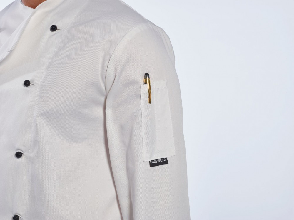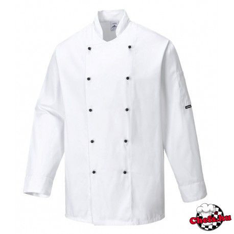 Divatos, magas minőségű alapanyagból készült séfkabát. Bőrbarát kevert szálas anyaga rendkívüli módon szín- és mérettartó.