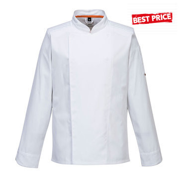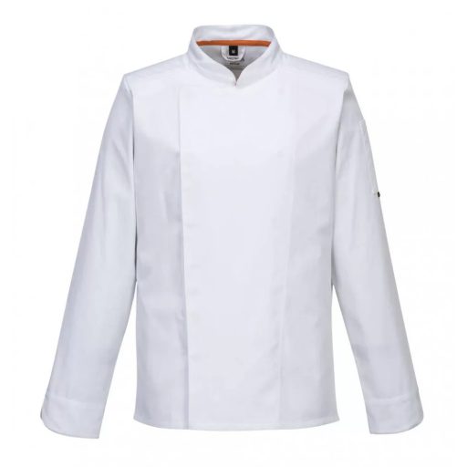 Ez a séf kabát ergonomikus viseletet és karcsú sziluettet biztosít. Dupla gombos rejtett záródás kötény akasztó fül a nyak hátsó részén és nagy méretű MeshAir Pro panelek amik kiváló légáteresztést biztosítanak.