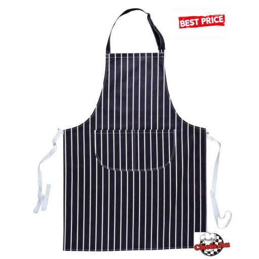 Striped apron with adjustable neck strap and 28 x 42 cm pocket.