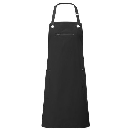 Kontrasztos melles kötény, állítható fém csattal. Kontrasztos anyagból készült megkötők fém fűzőlyukakkal.