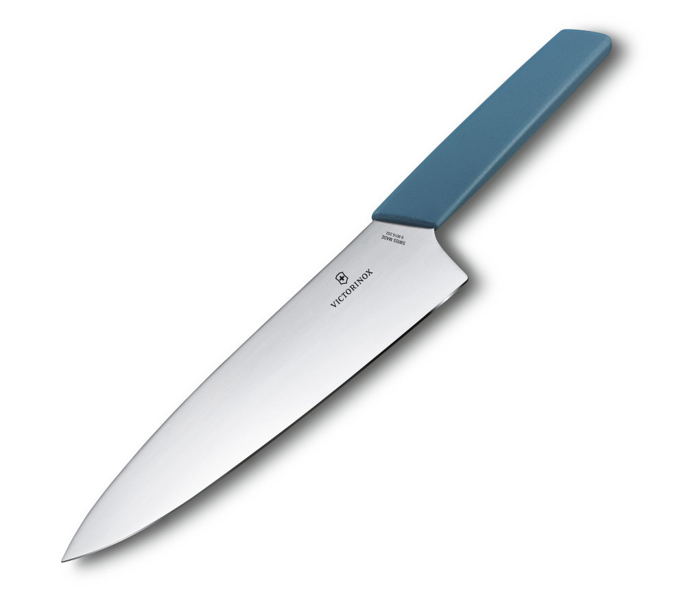 A Swiss Modern Séfkés a konyha igazi központi eszköze – erőteljes, mégis elegáns, és minden vágásnál maximális kontrollt biztosít. A 20 cm-es, extra széles, rozsdamentes acél penge könnyedén megbirkózik a húsokkal, dinnyével vagy padlizsánnal, miközben precíz és tiszta vágásokat eredményez.