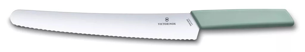 A Swiss Modern Kenyér- és Péksüteményvágó kés a mindennapi otthoni sütés nélkülözhetetlen eszköze. A hullámos élű, rozsdamentes acél penge tökéletesen siklik át kenyéren, kalácson, pitéken, focaccián vagy tortán, anélkül hogy roncsolná a tésztát.