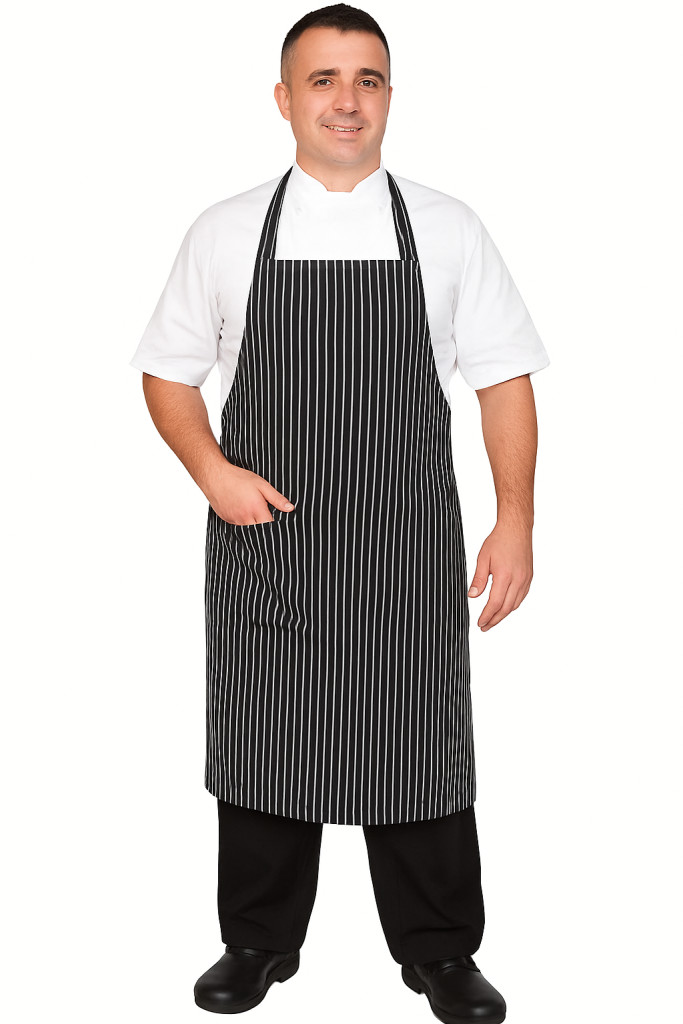 Bib apron with adjustable neck strap and a 20x20 cm pocket on the right side.