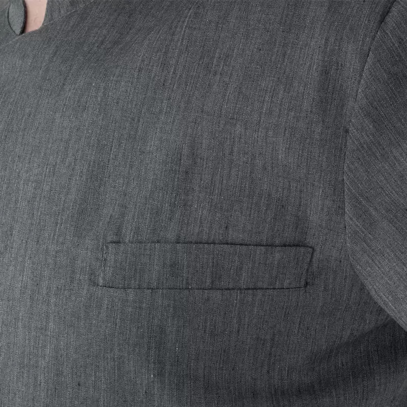 A klasszikus álló (koreai) gallér és a rejtett gombolás kifinomult, modern stílust kölcsönöz.