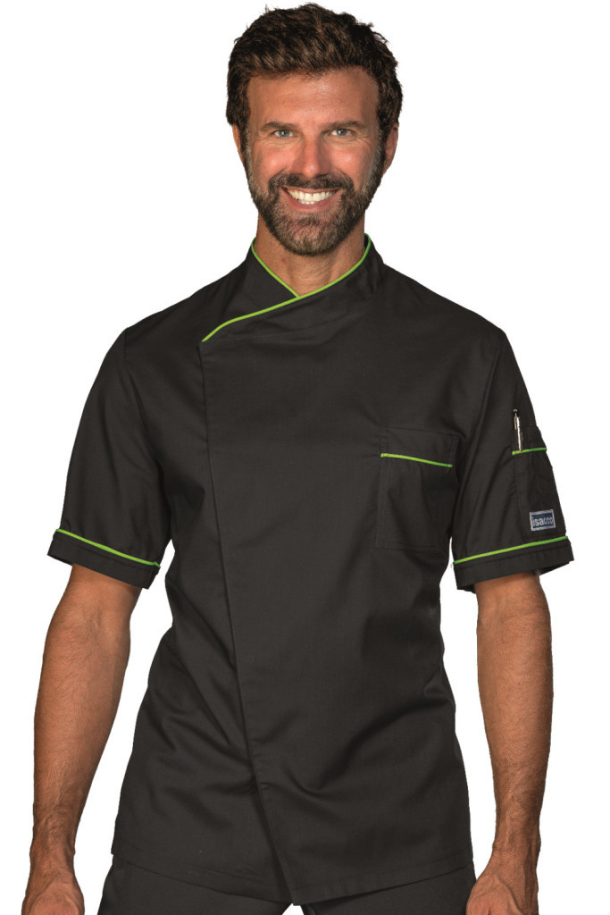 Dubai fekete rövid ujjú szakácskabát zöld paszpóllal díszítve Dubai fekete rövid ujjú szakácskabát zöld paszpóllal díszítve