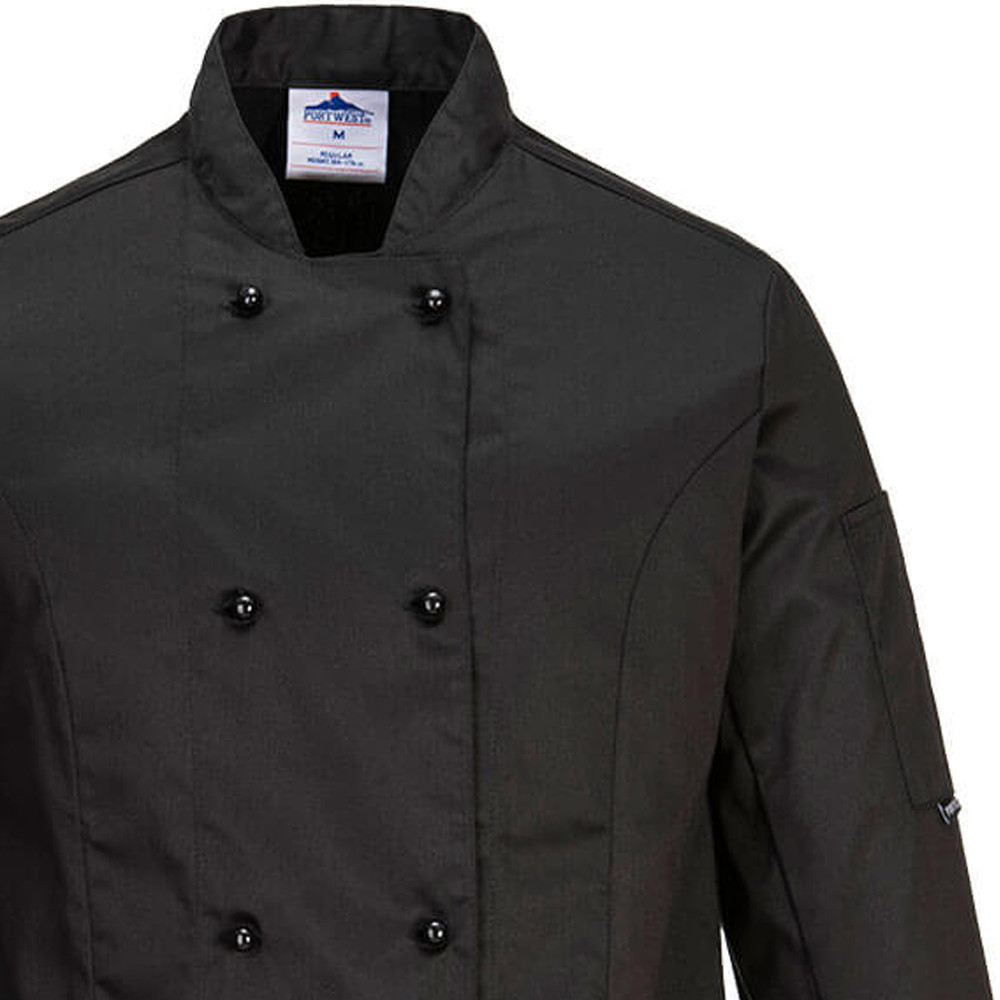 Ez a séfkabát kimondottan hölgyek számára készült, hogy biztosítsa a maximális kényelmet és funkcionalitást, miközben tökéletesen illeszkedik. A kabát oldalán, mandzsettáján és hónalj részén MeshAir szellőzőnyílások találhatók, amelyek garantálják a megfelelő légáramlást. A stílusos dizájn részeként a kabát négy sor megfordítható, levehető gombokkal rendelkezik, emellett praktikus zsebek is találhatóak rajta.